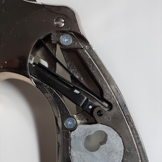 Red boxes - The left hand red box surrounds the cylinder lock, and the right hand box surrounds the cylinder lock notch. When the cylinder is pushed into the revolver and twisted, the cylinder lock is compressed and then decompresses into the cylinder lock notch, keeping the cylinder firmly in place. As can be seen diagonally up to the right hand box are markings where the cylinder has rotated and the lock has slightly marked it as per real steel version.