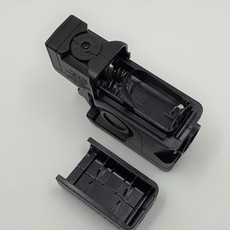The MK23 comes with the LAM (Laser Aiming Module) already fitted to the MK23. The LAM is made entirely of plastic and without batteries installed weighs next to nothing. The LAM features a white light and a red light (labelled as a 'laser'), however neither are of any use and should not be relied on for anything other than show. There are several manufacturers across the internet that sell replacement parts to allow the user to install a LED light and miniature red laser pointer. The LAM slides onto the MK23 rails and a turn screw is used to screw it into the MK23s' trigger guard securing it in place. At the rear of the LAM there is a paddle switch. Pushing the paddle all the way to the left until it clicks into place activates the lights and they remain permanently on until the paddle is moved to the right. Pushing the paddle all the way to the right and letting go temporarily activates the lights. The battery compartment can be accessed underneath by carefully squeezing the battery module together and pulling forwards. The LAM requires 3 AAA batteries. On the underside is also a small dial labelled 'ON OFF' with arrows. This is the LAM on/off switch.