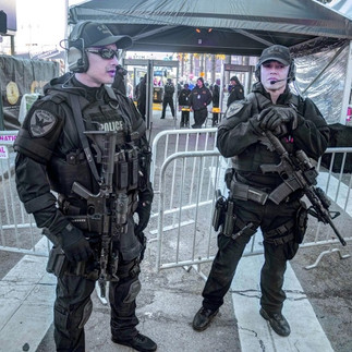 Black kit is generally associated with a whole host of police forces across the globe, notably SWAT (Special Weapons And Tactics) elements of Police Departments and private security. Black uniforms create an authoritarian presence and when seen in force can be seen as dominating and oppressive.